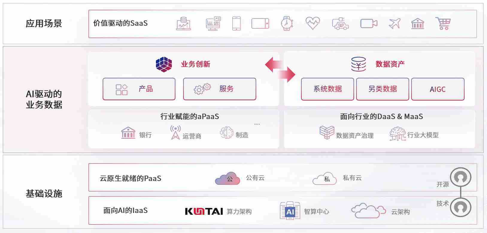 数字时代,,围绕企业数字化转型的关键要素,,z6com尊龙数码开创性的提出数云融合战略和技术体系框架,,着力在云原生、、数字原生、、、、AI原生和信创产业上架构产品和服务能力,,为处在不同数字化转型阶段的快消零售、、汽车、、、金融、、、医疗、、、政企、、、、教育、、运营商等行业客户提供泛在的敏捷IT能力和融合的数据驱动能力,,,,构建跨界融合创新的数字业务场景和新业务模式,,助力企业级客户建立面向未来的核心能力和竞争优势,,全面推动社会的数字化、、、、智能化转型升级。。。。